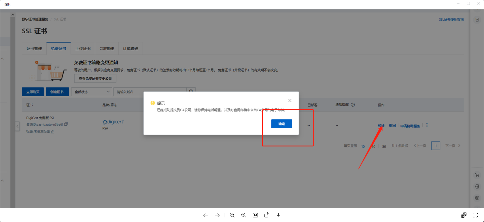 配置完成之后回到阿里云,dns值就会检验正确,这个时候等待证书签发,签发成功后就可以点击下载了