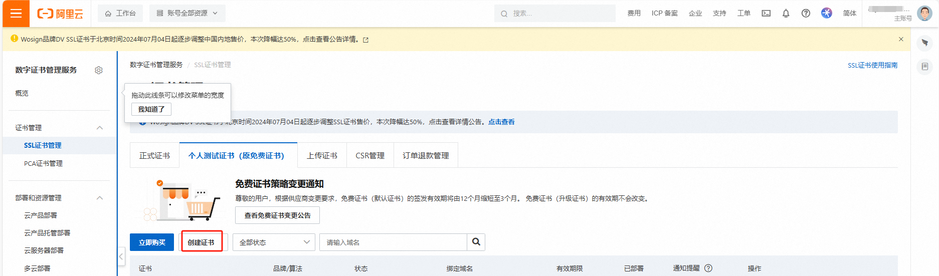 2、SSL证书控制台-SSL证书资源包-立即购买,按截图选择个人测试证书(原免费证书)