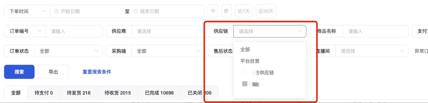 (2)供应商:支持筛选平台自营、全部供应商、指定供应商订单;