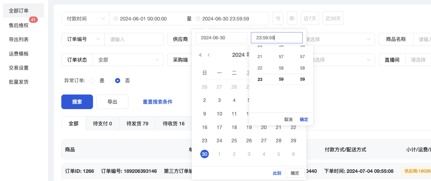 比如搜索6月1号0点到30号23点59分这段时间的支付订单,可以选择付款时间,开始日期选6月1号0点,结束日期选6月30号23点59分59秒,如下图所示。