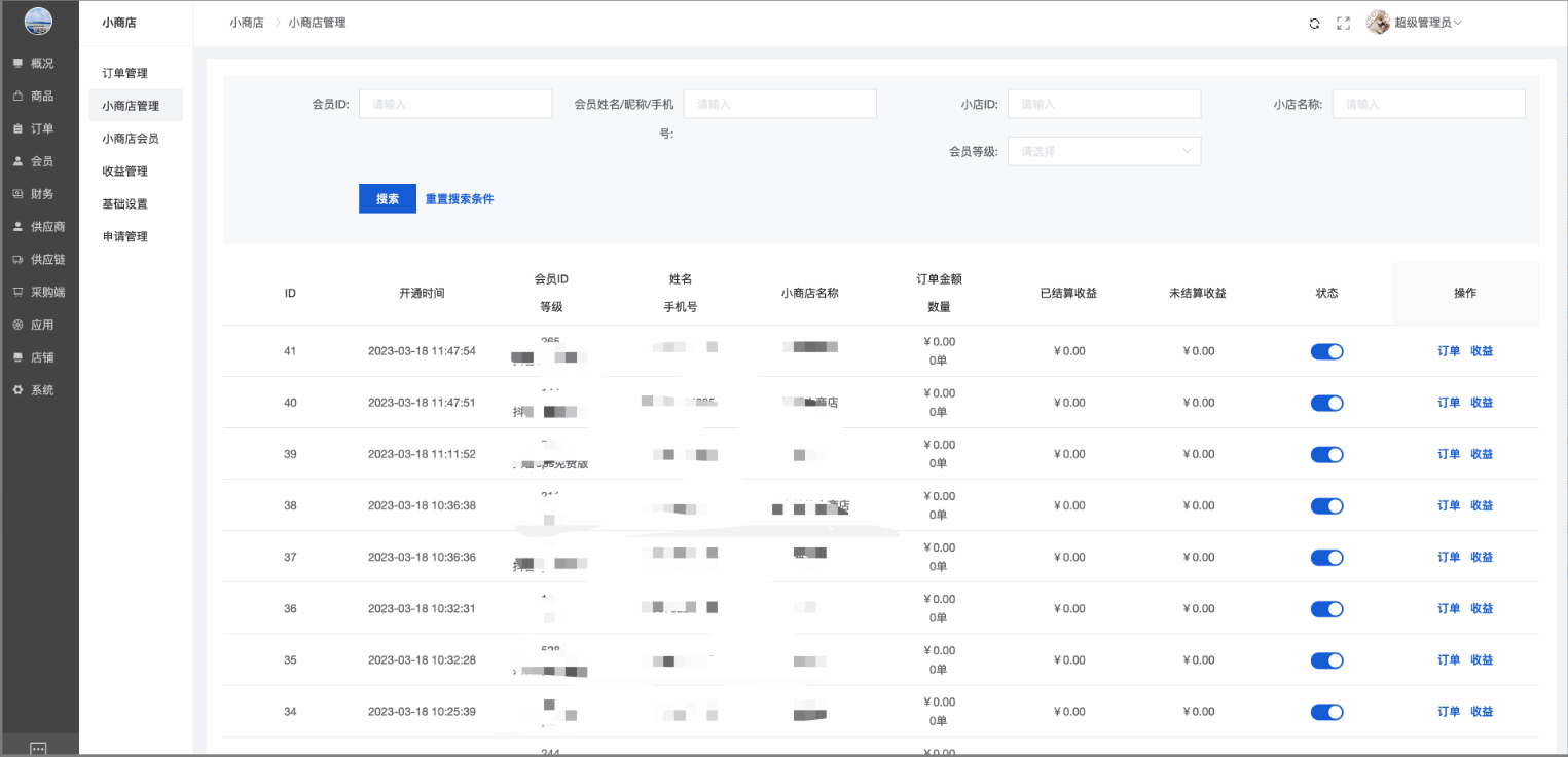 显示所有的小商店列表,支持查看小商店订单、收益等。