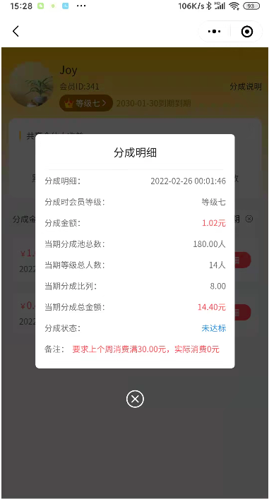 6、点击明细可查看到该条分成的具体明细(未达标的还会显示未达标备注)