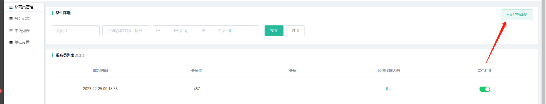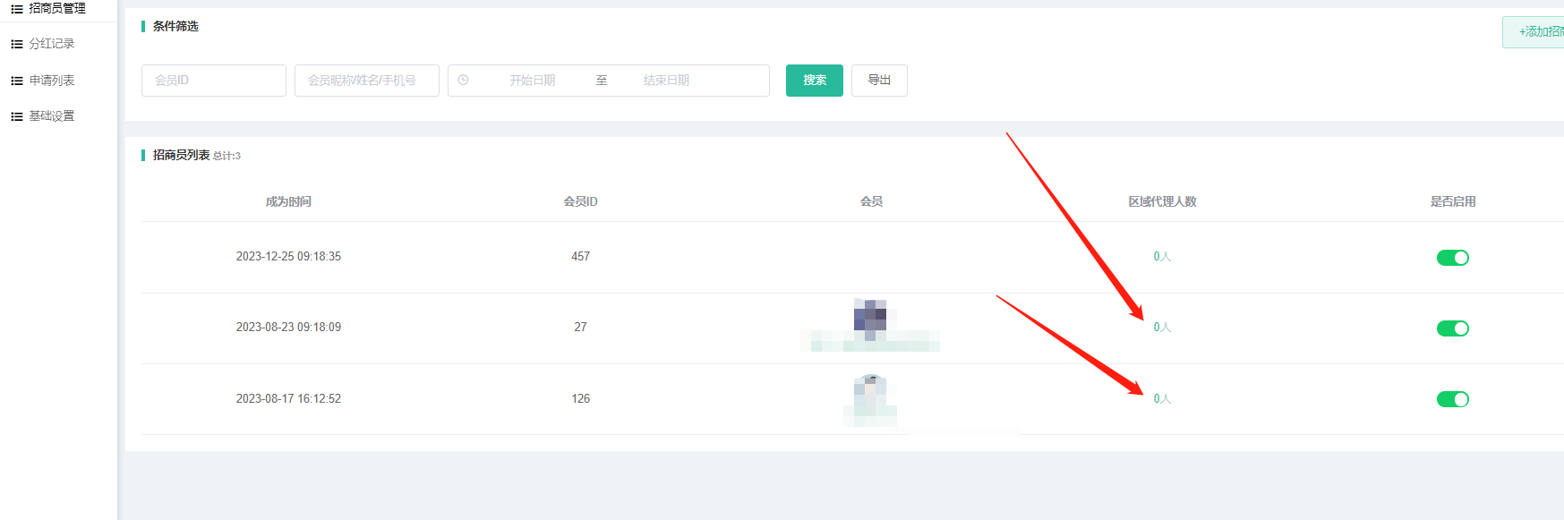 1) 会员成为招商员就会在该列表显示,在该列表可查看到招商员成为时间,会员信息区域代理人数