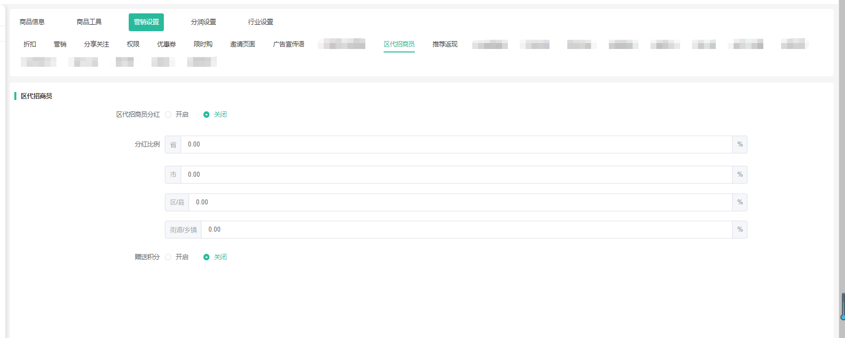 8) 商品设置:商品编辑—营销—区代招商员,开启后购买该商品才会产生奖励,可独立设置比例,比例设置为0为空则按照插件设置