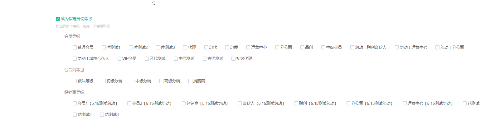 C:指定会员身份等级成为:会员等级、经销商等级、分销商等级,只需满足其中一个身份的一个等级