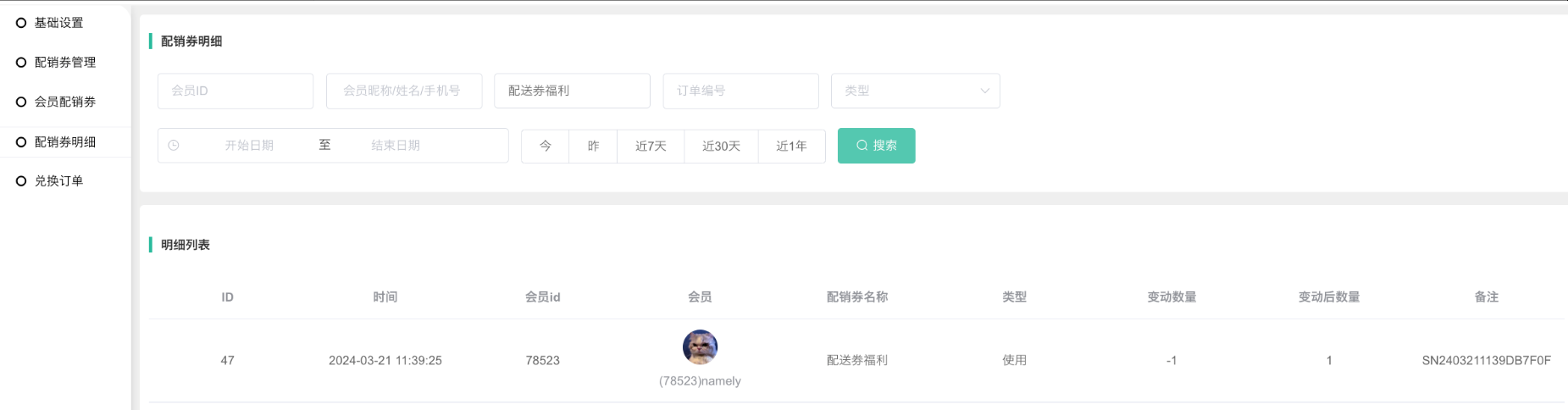 1、按照会员显示配销券。配销券总量包含过期的配销券。会员购买商品获得配销券,或者是后台手动发放,会员配销券列表会有相关显示。