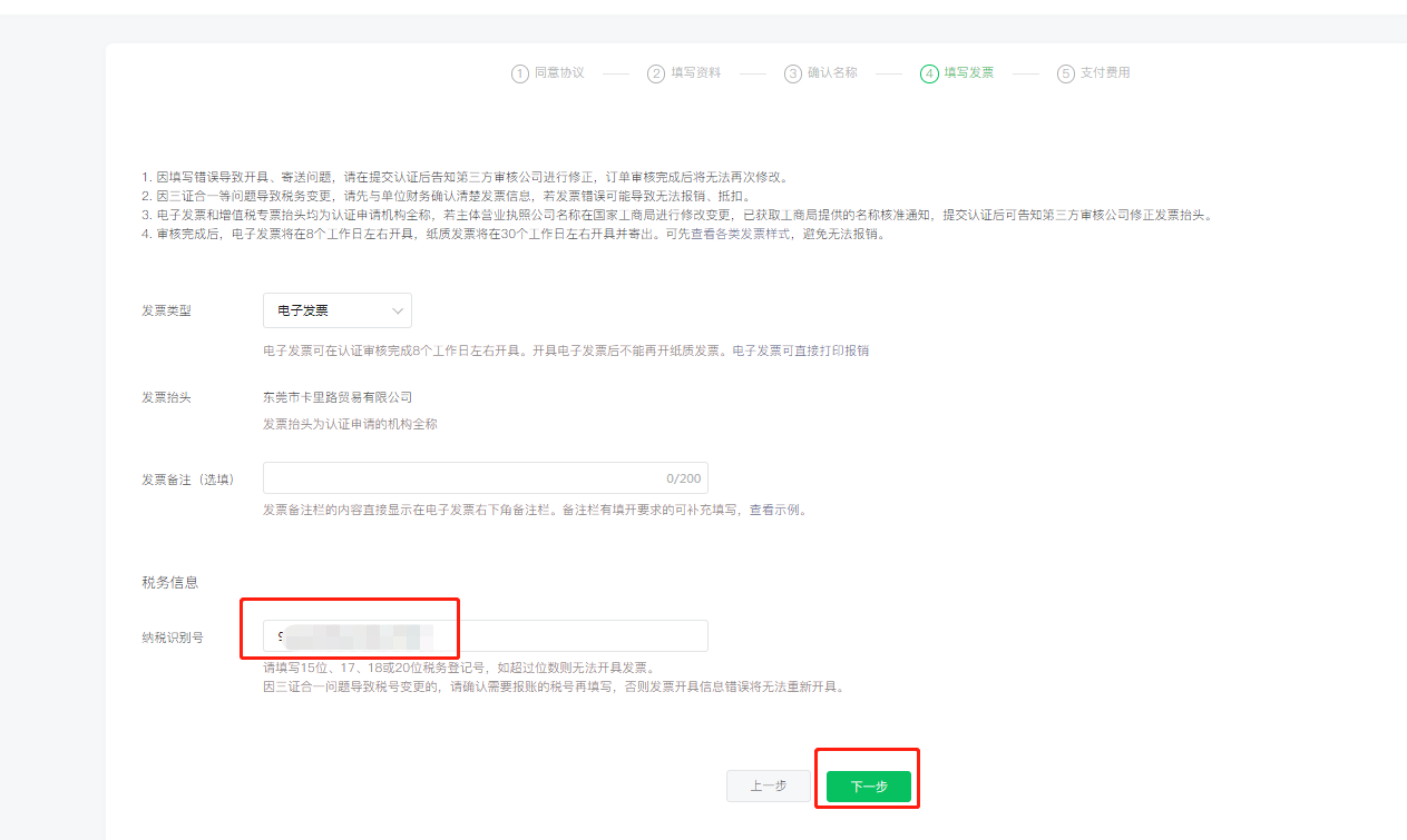 7.扫码支付,填写发票-输入纳税识别号-下一步-扫码付款-等待腾讯审核-注意电话接听(以下案例10分钟完成认证)