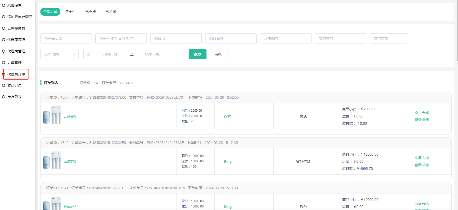 代理商订单:代理商在前端进货的订单信息,订单支付后完成(不需要发货)