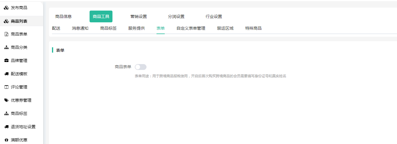 固定表单,开启后用户下单时判断其是否填写过姓名、身份证号,如果没有,则进行填写;用于跨境电商商品销售收集用户身份证信息。