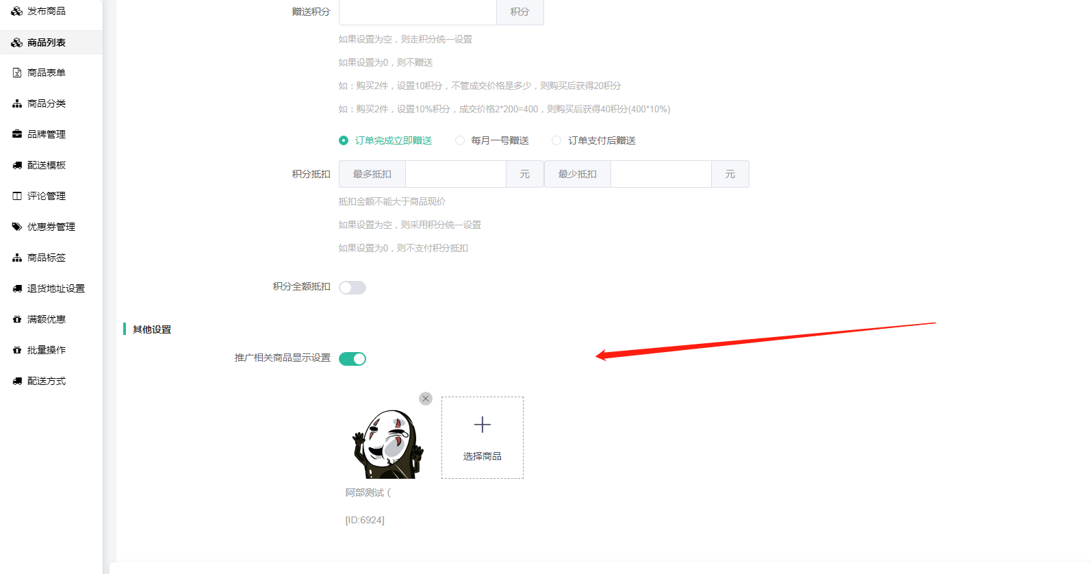 推广相关商品显示设置:选择关联推荐商品,显示在商品详情页最下方。