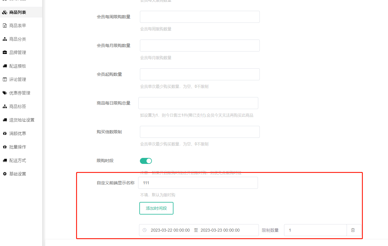 限购时段:注意:如果开启限购时段还开启限时购,则优先走限购时段