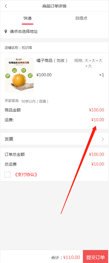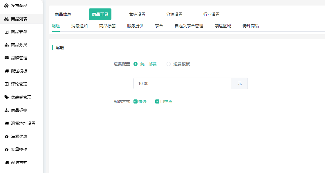 支持设置商品统一运费金额或者选择运费模板,运费计算规则详见配送模板章节。