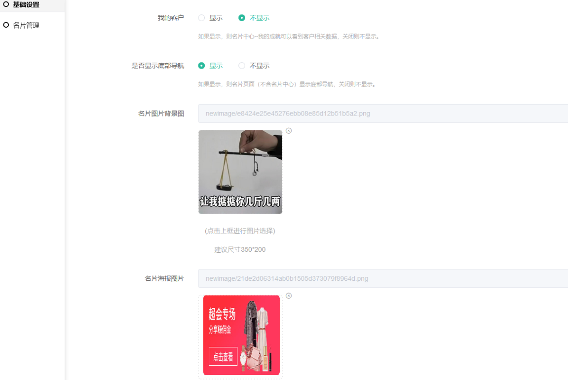 9,名片图片背景图:设置后可在名片前端名片图片处插件【建议尺寸 325*160】