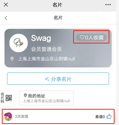 2,访问次数为用户访问你的名片的次数,刷新一下也会增加一次;收藏次数为用户收藏你的名片的次数;靠谱次数为点赞次数