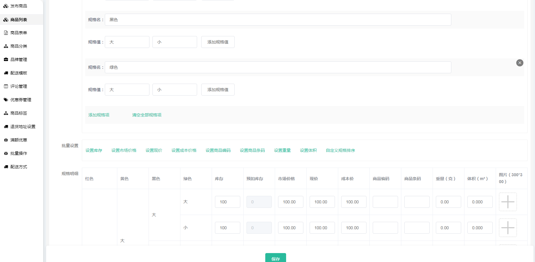 每一种规格项都可以单独设置库存、市场价格(原价)、现价、成本价格、商品编码、商品条码、重量、体积,图片,自定义规格排序。